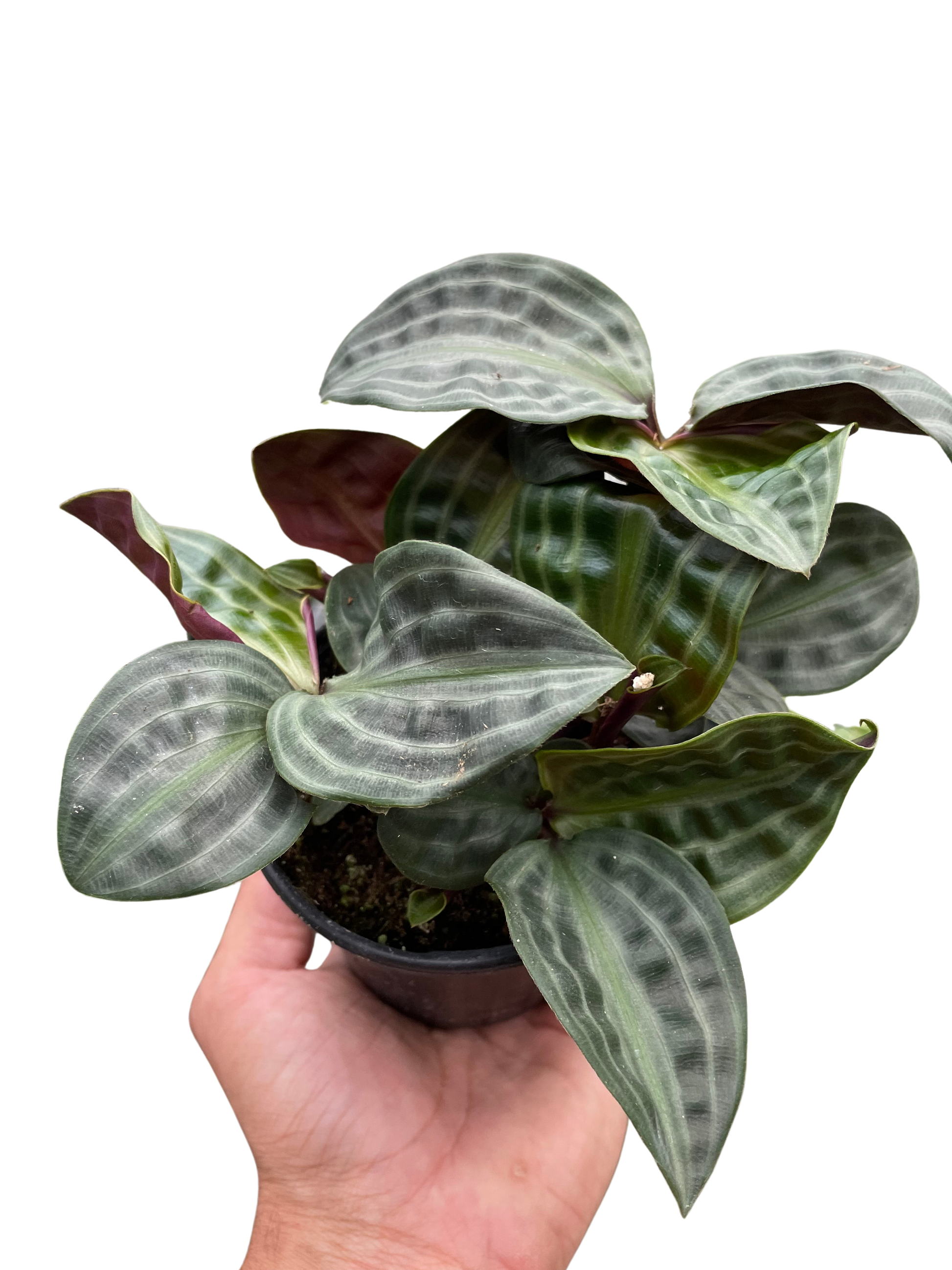 - Description: The Geogenanthus Seersucker plant is a unique and eye-catching perennial that is native to Brazil. It is characterized by its crinkled, textured leaves that resemble the fabric of seersucker. The plant typically grows to be around 12 inches tall and 18 inches wide, making it a great choice for small indoor spaces or as an accent in larger arrangements. It prefers bright, indirect light and moderate watering, allowing the soil to dry out slightly between waterings. The Seersucker Plant's unique texture and low maintenance make it a popular choice for adding interest and greenery to indoor spaces.